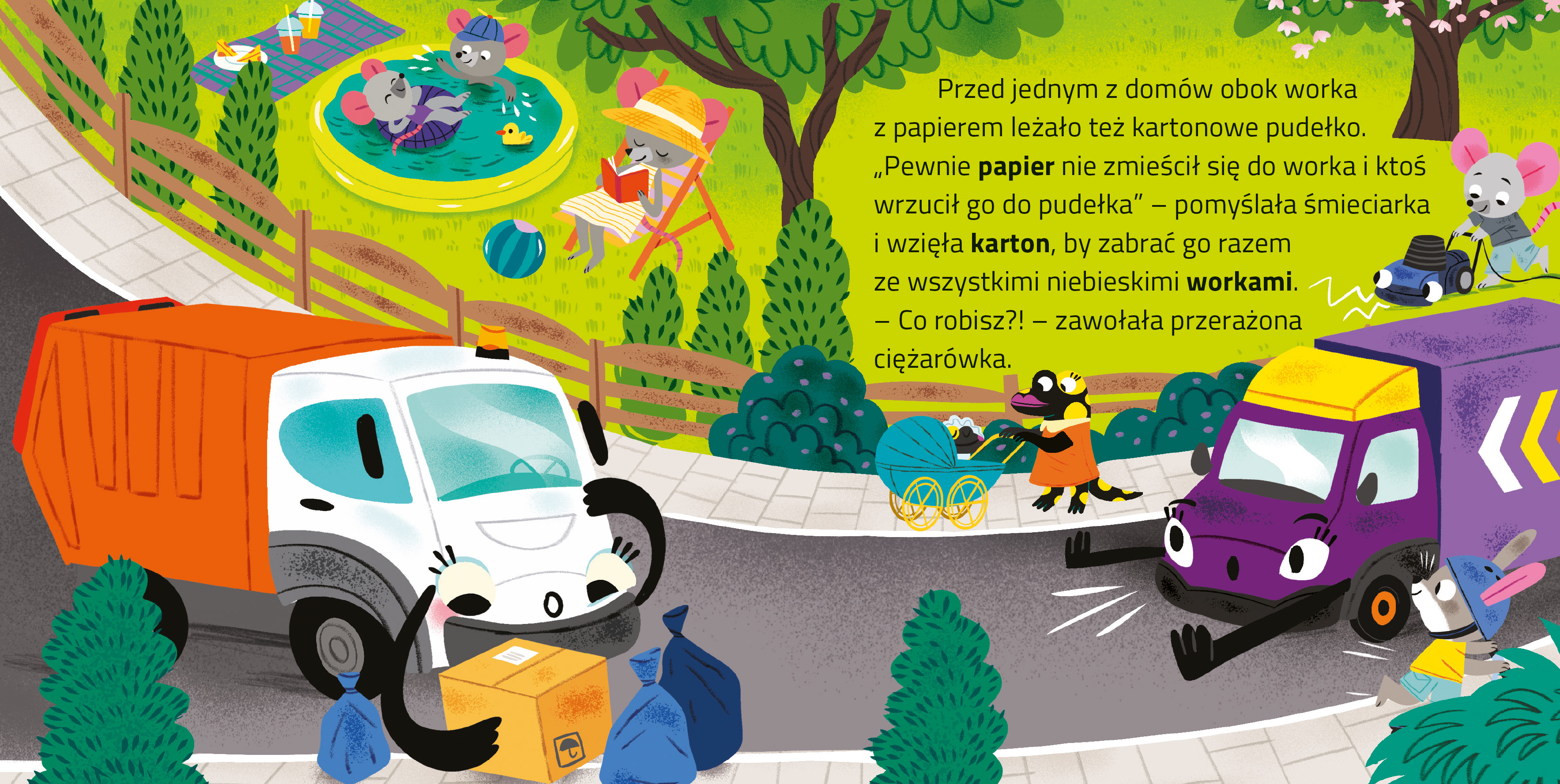 „Odjazdowe samochody. Śmieciarka” to pełna humoru i dynamiczna książeczka kartonowa dla dzieci, która opowiada o pracy pojazdów komunalnych. Główna bohaterka – sympatyczna śmieciarka – przez pomyłkę próbuje zabrać świeżo dostarczoną paczkę, myśląc, że to odpadki. Ta zabawna historia, napisana prostym językiem, świetnie trafia do kilkulatków i uczy, że każdemu mogą zdarzyć się wpadki, a w takich sytuacjach ważne są wsparcie i pomoc przyjaciół.