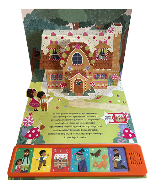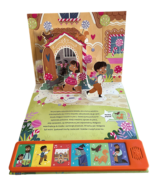 Książka zawiera czytany przez lektorkę tekst baśni, który jest odtwarzany po naciśnięciu przycisku, znajdującego się na każdej rozkładówce. Dodatkowo, książka jest przestrzenna – po otwarciu ukazują się rozkładane baśniowe scenki, które sprawiają, że historia staje się jeszcze bardziej wciągająca.