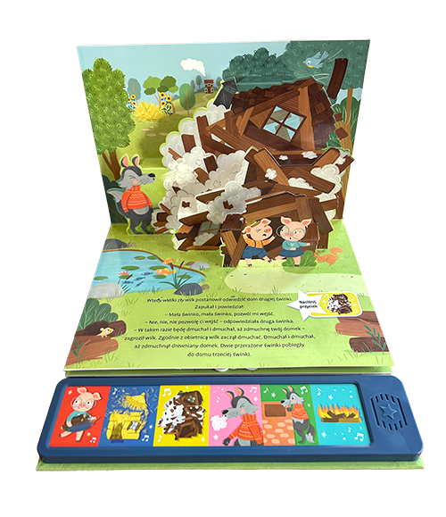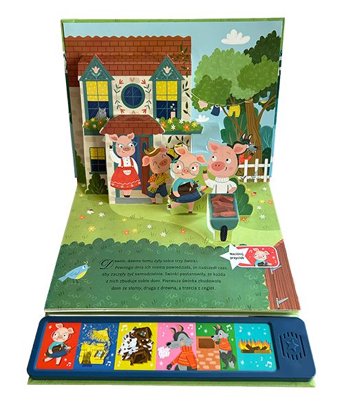 Książka zawiera czytany przez lektorkę tekst baśni, który jest odtwarzany po naciśnięciu przycisku na każdej rozkładówce. Dodatkowo, książka jest przestrzenna – po otwarciu ukazują się rozkładane baśniowe scenki, które wzbogacają opowieść o interaktywne elementy, sprawiając, że maluch może w pełni zanurzyć się w bajkowym świecie.